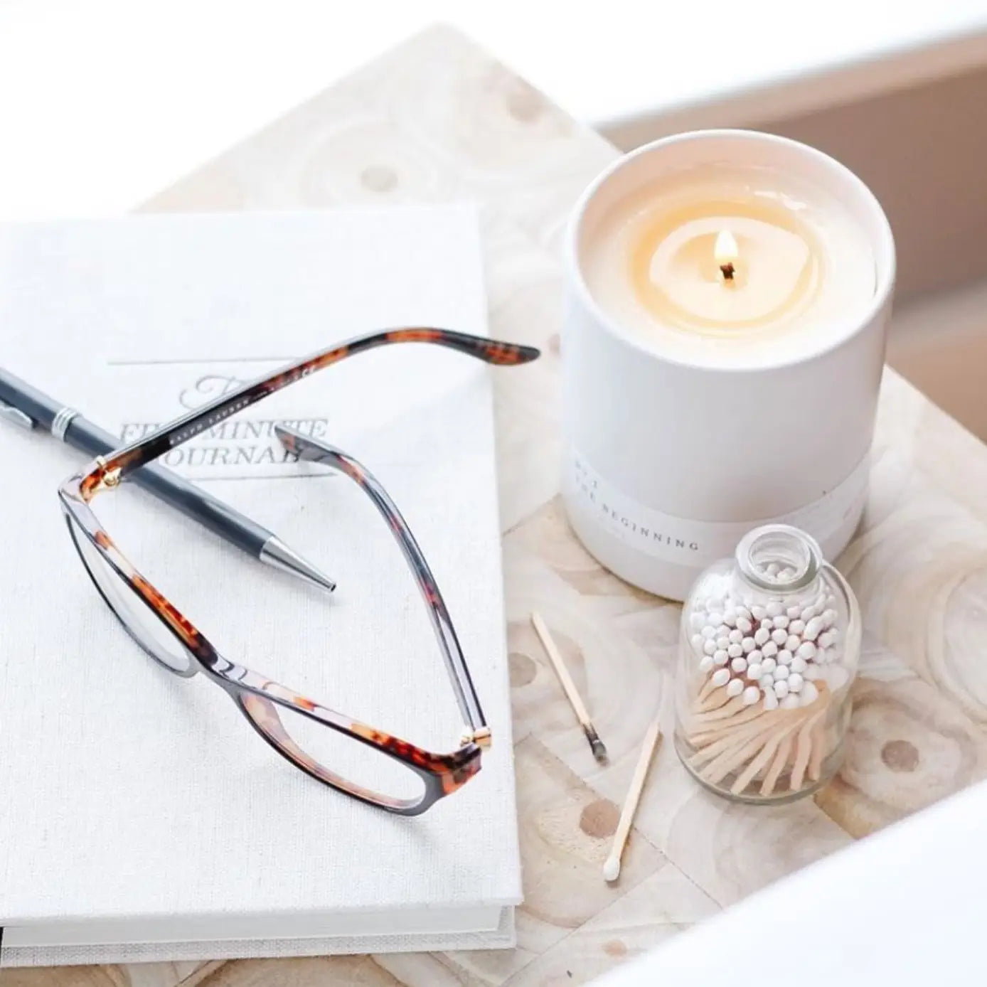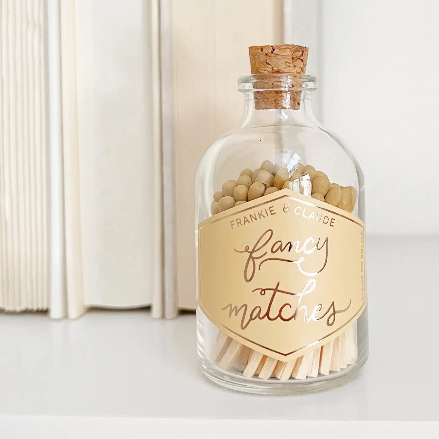 The matches inside a corked glass bottle with a gold foil geometric label make this a perfect addition to sunny outdoor setups, citrus-scented candles, and modern summer decor. Whether displayed in a bohemian picnic setup, al fresco dining collection, or seasonal home refresh, this match jar captures the essence of warm-weather living.